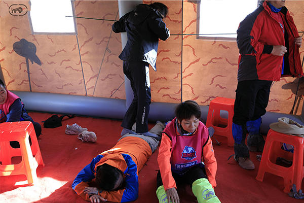傍晚達到營地,每個人都風塵仆仆,脫下襪子腳腫了一圈,有的襪子被血水模糊了,撕下來淚水隱忍而出??粗苓叺耐?,原以為她自己情況是最慘的,但不知團隊里有人原本就膝蓋痛,有的人發(fā)燒,有的人也來例假,有的人近240斤仍不懈前行,有的人比自己還要高齡也不放棄。