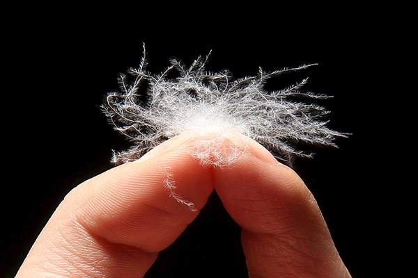 羽絨有一個三維結(jié)構(gòu),所以它可以“擴展”。在相同的重量下,絨毛中的每一簇細絲都能比其他任何材料容納更多的空氣。每克羽絨大約有70000根細絲,這些細絲相互重疊、纏繞形成一層保護層,通過保持空氣在適當?shù)奈恢脕肀3譁嘏徒^緣。