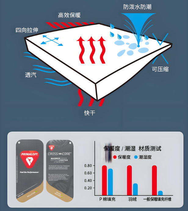 Primaloft 最初是為美國陸軍研發(fā),旨在模擬羽絨的保暖性,同時克服羽絨潮濕后保暖性驟降的缺點。它的核心優(yōu)勢包括: