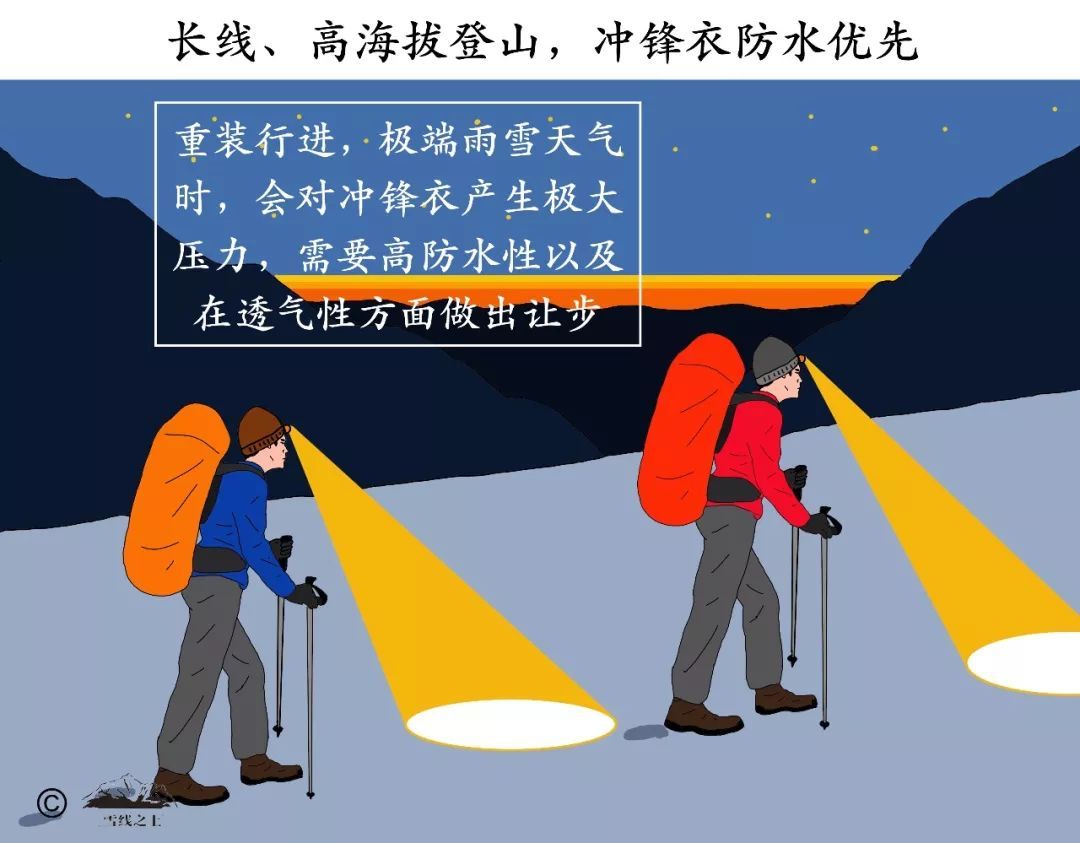 沖鋒衣的防水性與透氣性不可兼得,你在選購時,就不能指望買一件“全能型”沖鋒衣,而應(yīng)該根據(jù)自己的戶外活動類型來平衡。
