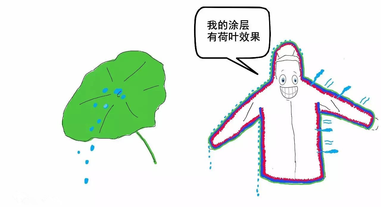 涂層可以實(shí)現(xiàn)“荷葉效果”,讓水珠滾落,同時水蒸氣能從面料縫隙排出。