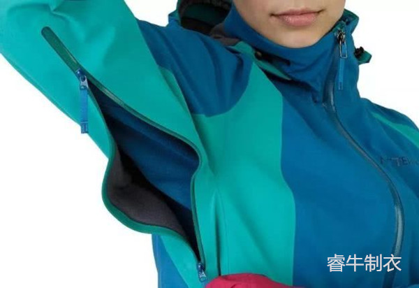 多數沖鋒衣都有設計在腋下散熱拉鏈的,它的作用是讓使用者在戶外活動中,根據實際使用情況調節服裝內的溫度。對于專業沖鋒衣來說,拉鏈一般都采用防水功能的產品。而滑雪服因為其運動的特點,一般是把拉鏈設計在胸口附近或者上肢的前方。和沖鋒衣的相同的是?;┓母邫n產品也使用防水拉鏈。