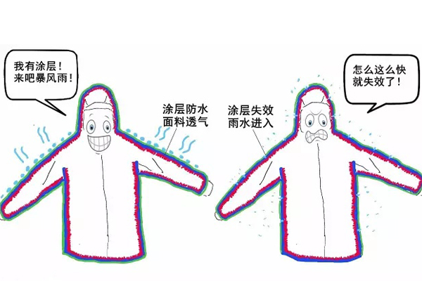 親水涂層《TU和TPU)上面這種方法主要用于PU防水涂層,PU防水涂層指的是在衣服表面織物里面附著一層防水涂層(PU聚氨酯),根據需要涂層厚度不等。親水涂層是在織物表面涂上一層親水涂層,由于涂層覆蓋了織物的所有空隙,因而可以防水。如果高分子鏈上有親水基因,含量和排列合適,則它們可以與水分子作用,借助氫鍵和其他分子間力,在高濕度一側吸附水分子,通過高分子鏈上親水基團傳遞到低濕度一側解吸。主要特點是防水效果比較好,加工方法簡單,但是透濕、透氣性能較差。