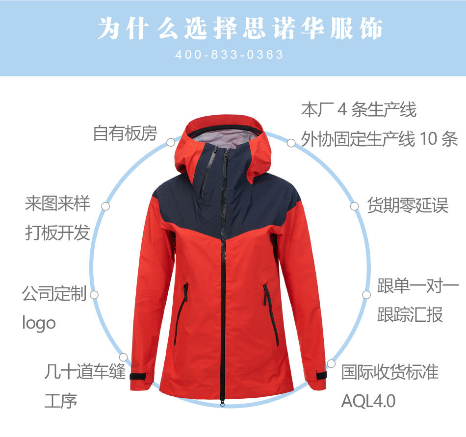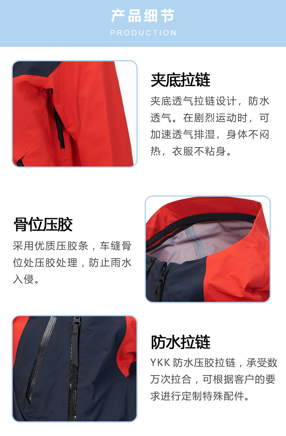 防水拉鏈:單層沖鋒衣生產(chǎn)使用YKK防水壓膠拉鏈,承受數(shù)萬次拉合,可根據(jù)客戶的要求進(jìn)行定制特殊配件。
