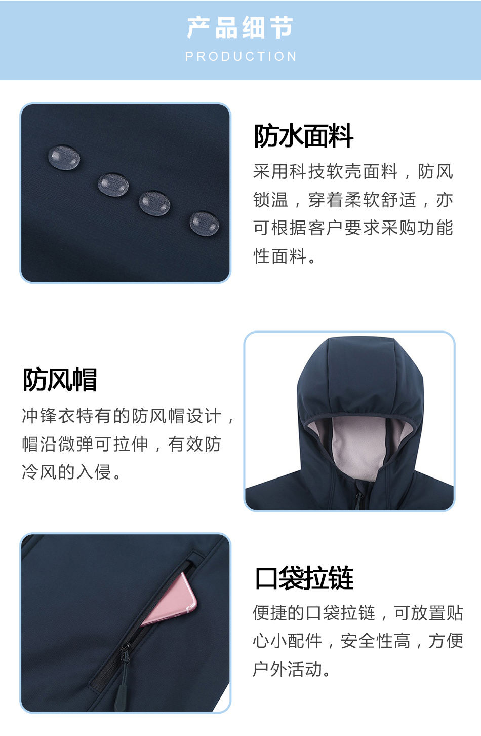 防水面料:采用科技軟殼面料,防風(fēng)鎖溫,穿著柔軟舒適,亦可根據(jù)客戶要求軟殼沖鋒衣定制采購功能性面料。