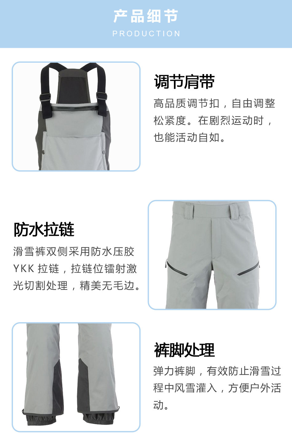 褲腳處理:彈力褲腳,有效防止滑雪過程中風雪灌入,方便戶外活動。