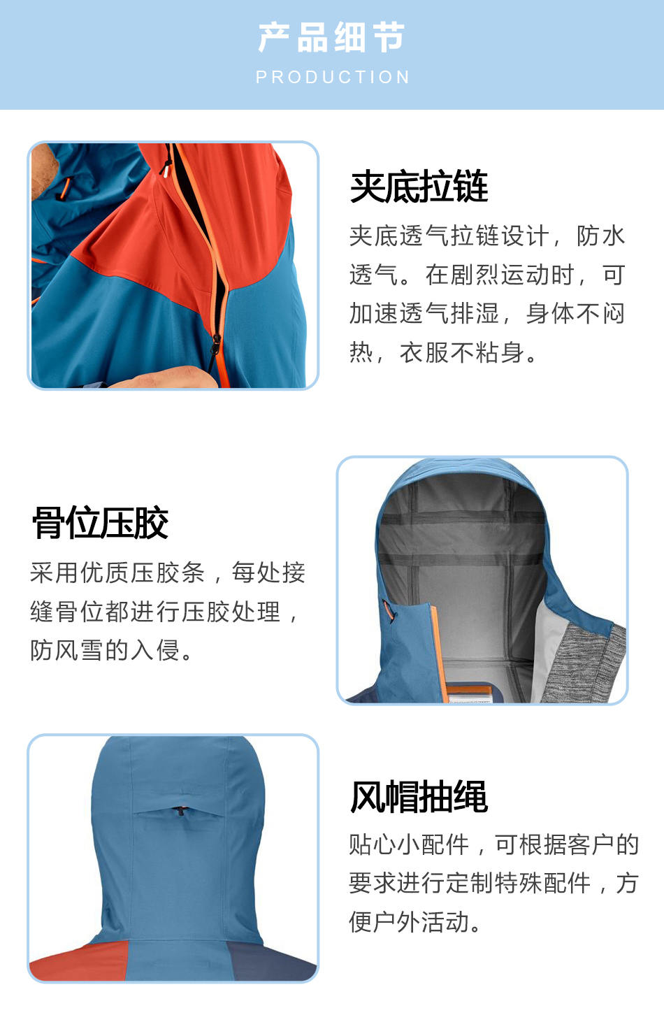 風帽抽繩:貼心小配件,可根據客戶的要求進行定制特殊配件,方便戶外活動。